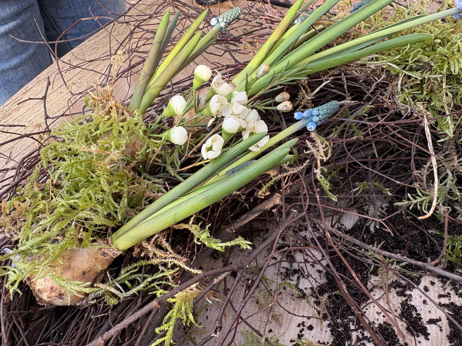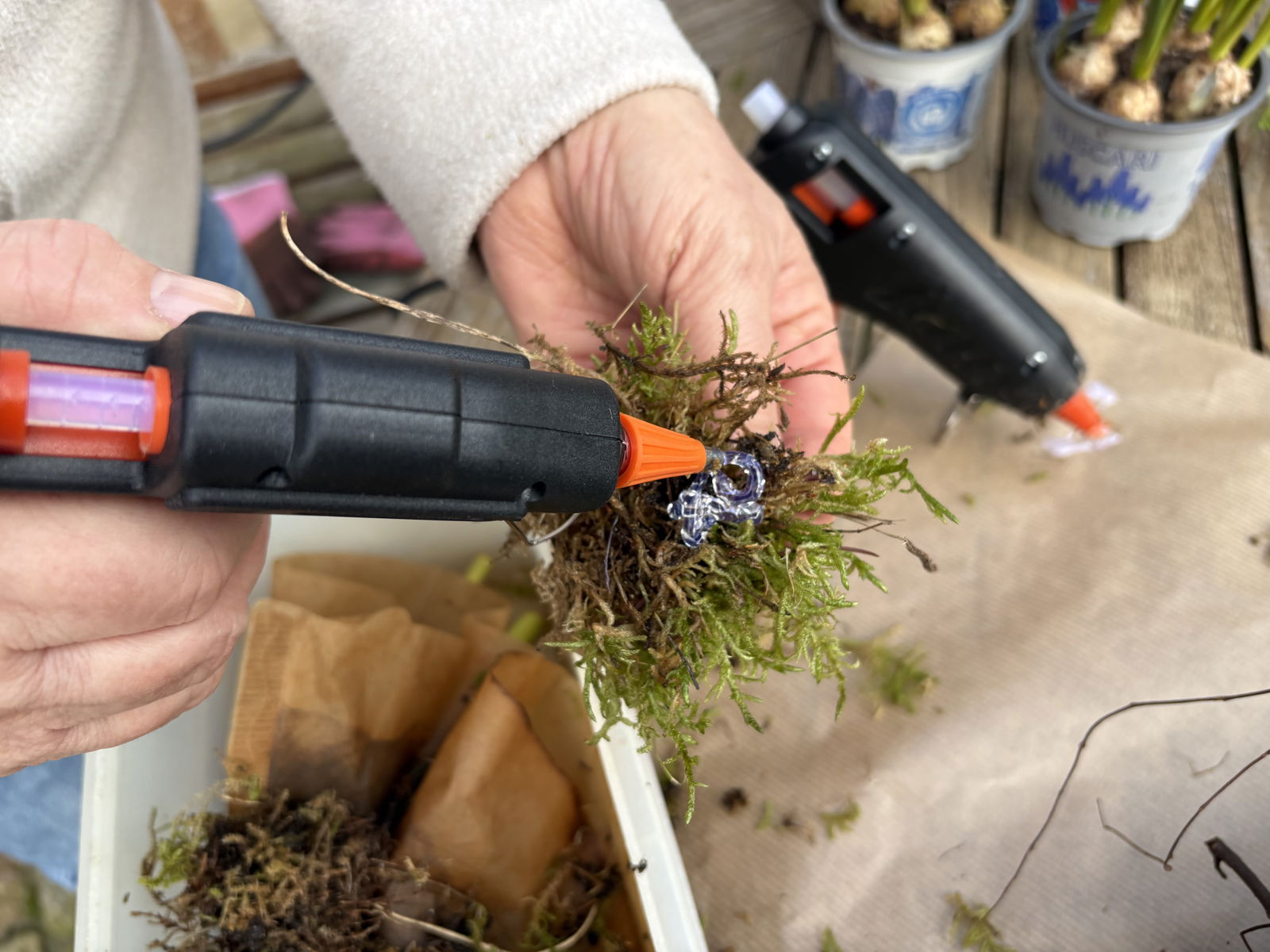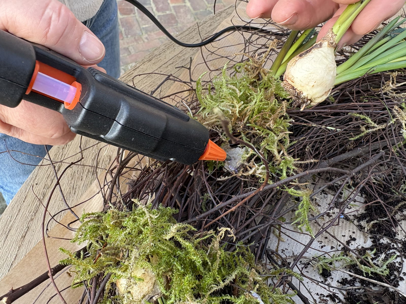 Die kleinen Zwiebelpflanzen vorsichtig aus ihren Töpfen lösen. Überschüssige Erde und lange Wurzeln leicht entfernen. Die Zwiebeln gleichmäßig rund um den Kranz zu verteilen und mit Heißkleber festkleben. Die Zwiebeln können auch leicht hinter den kleinen Moosplatten versteckt werden.