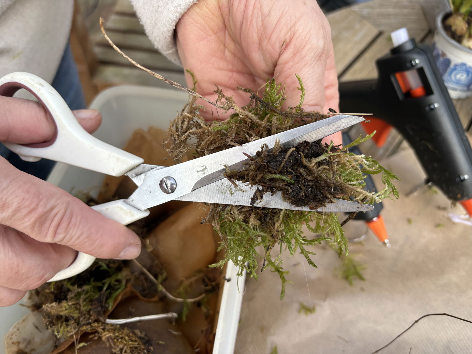 Kleine Portionen Moos abreisen und mit der Heißklebepistole auf dem Kranz befestigen. Wenn zu viel Erde an dem Moos hängt, diese abschneiden. Das Moos dient später als natürlicher Hintergrund und hilft, Feuchtigkeit für die Pflanzen zu speichern.