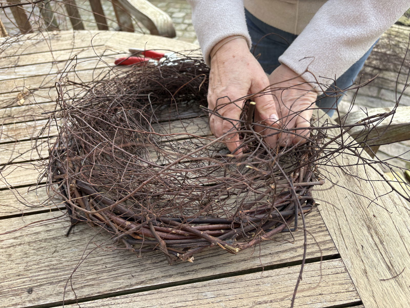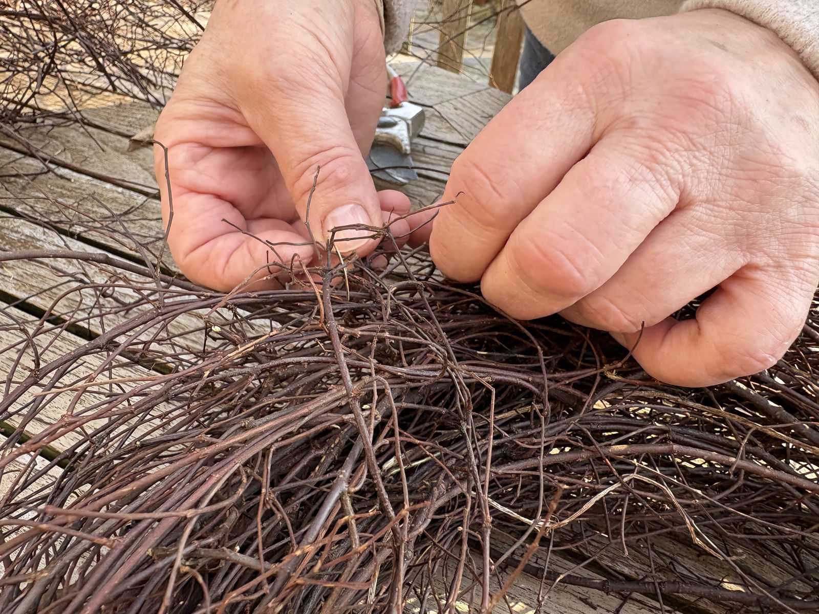 Den Kranzrohling locker von abstehenden Zweigen befreien. Wer möchte, kann ihn mit zusätzlichem Reisig oder Ranken noch etwas üppiger gestalten. Wir haben altes Gestrüpp von einer Mühlenbeckia-Pflanze verwendet. Das Gestrüpp locker mit Bindedraht befestigen.