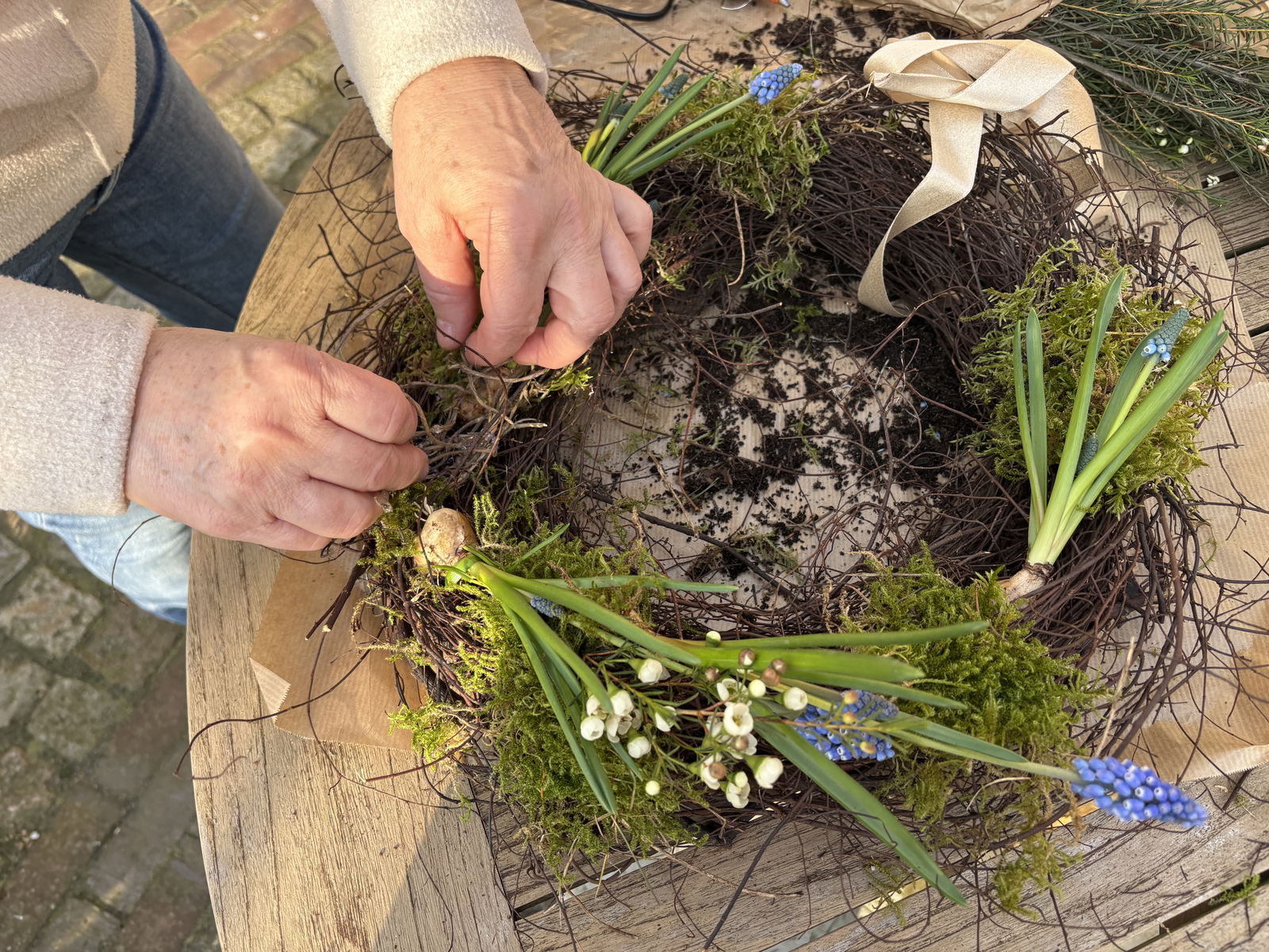 Damit die Zwiebelpflanzen möglichst lange frisch bleiben, den Kranz regelmäßig leicht besprühen oder vorsichtig von hinten befeuchten. Ideal ist ein geschützter Platz an der Haustür oder auf dem Balkon.