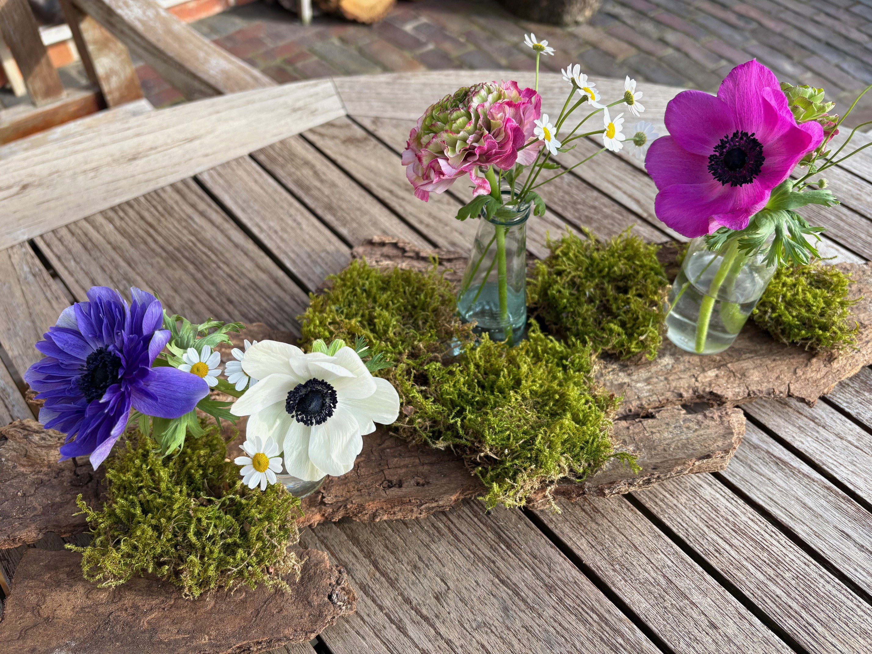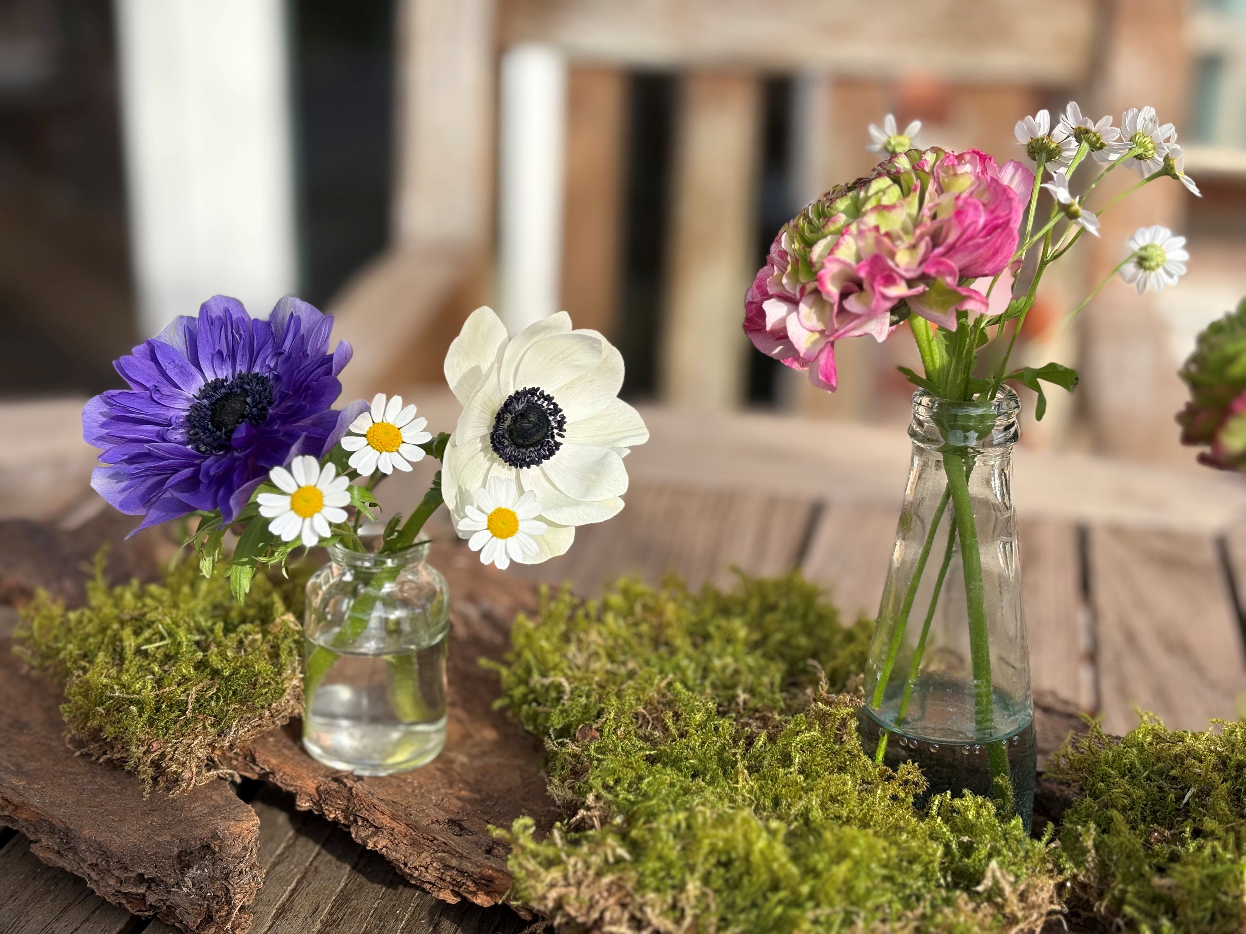 Frische Blumen (z. B. Anemonen, Ranunkeln oder kleine Wiesenblumen)