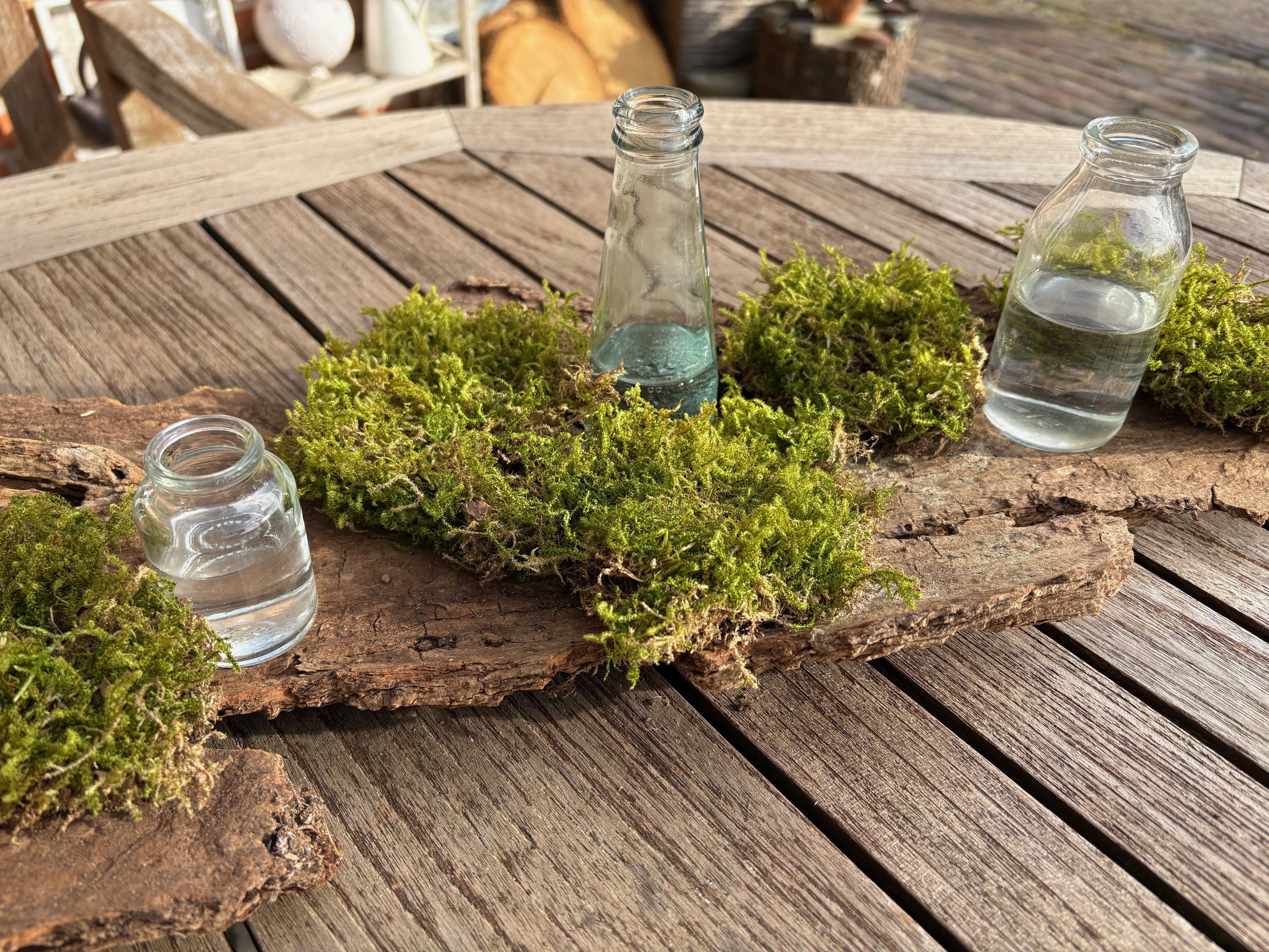Stelle mehrere kleine Glasfläschchen oder Mini-Vasen auf die Rinde. Ordne sie leicht versetzt an, damit das Arrangement lebendig wirkt.